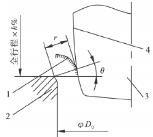 確定閥門(mén)流量系數(shù)CV值后按式(3)計(jì)算出A0,然后根據(jù)式(4)針對(duì)閥瓣某一閥瓣開(kāi)度h%時(shí)計(jì)算出調(diào)節(jié)閥的閥瓣型面所形成的等效節(jié)流流路的面積A。按照?qǐng)D1所示閥座密封點(diǎn)處畫(huà)出一條射線段使其與水平夾角為θ,長(zhǎng)度為r。假設(shè)此點(diǎn)剛好為此閥瓣開(kāi)度h%時(shí)閥瓣型面上的點(diǎn),即此射線段所形成的圓臺(tái)側(cè)面積與A值一樣,即有