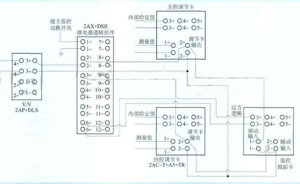 正常情況系統(tǒng)在主控模式下運行。此時,2+、2-為常閉觸點,3+、2-為常開觸點,6端為低電平時,觸發(fā)應控跟蹤卡工作。應控跟蹤卡的輸入引自繼電器邏輯組件2-端,輸出到3+端,使得2+端和3+端電位相同,實現跟蹤主控調節(jié)卡的功能。