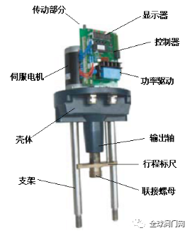 其電動(dòng)執(zhí)行器主要是由相互隔離的電氣部分和傳動(dòng)部分組成,電機(jī)作為連接兩個(gè)隔離部分的中間部件。電機(jī)按控制要求輸出轉(zhuǎn)矩,通過多級(jí)正齒輪傳遞到梯形絲桿上,梯形絲桿通過螺紋變換轉(zhuǎn)矩為推力。因此梯形螺桿通過自鎖的輸出軸將直線行程傳遞到閥桿。執(zhí)行機(jī)構(gòu)輸出軸帶有一個(gè)防止傳動(dòng)的止轉(zhuǎn)環(huán),輸出軸的徑向鎖定裝置也可以做動(dòng)位置指示器。輸出軸止動(dòng)環(huán)上連有一個(gè)旗桿,旗桿隨輸出軸同步運(yùn)行,通過與旗桿連接的齒條板將輸出軸位移轉(zhuǎn)換成電信號(hào),提供給智能控制板作為比較信號(hào)和閥位反饋輸出。同時(shí)執(zhí)行機(jī)構(gòu)的行程也可由齒條板上的兩個(gè)主限位開關(guān)開限制,并由兩機(jī)械限位保護(hù)。